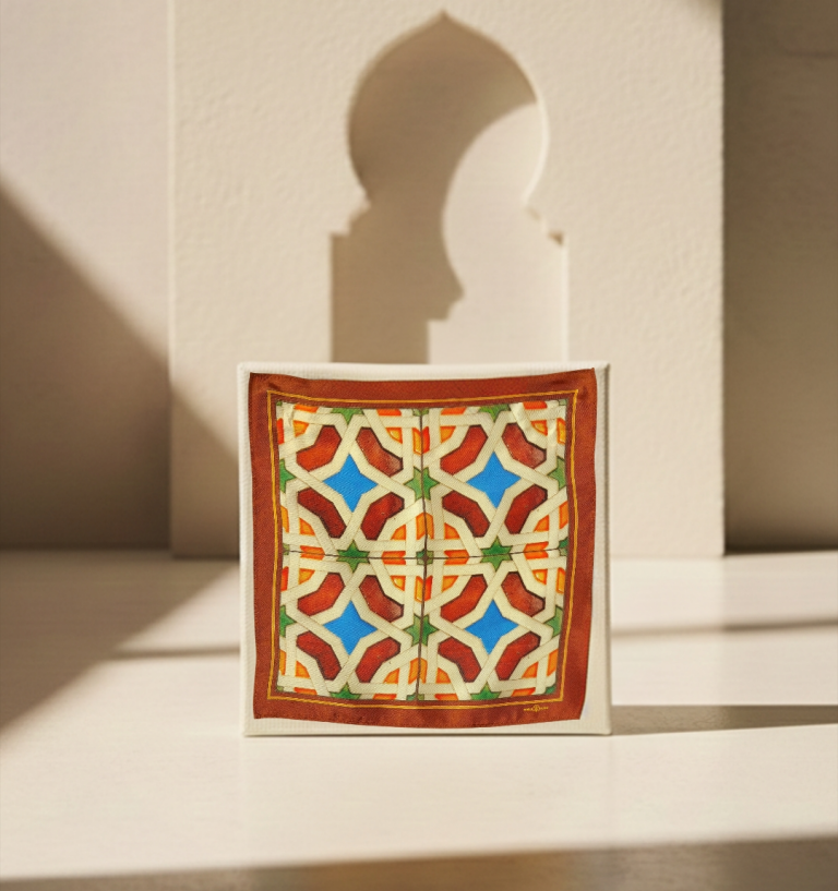 Sus formas geométricas evocan los antiguos azulejos andalusíes, donde cada línea tiene sentido y cada color guarda equilibrio. El contraste entre tonos cálidos y azules profundos refleja la esencia del sur: sol, historia y artesanía.