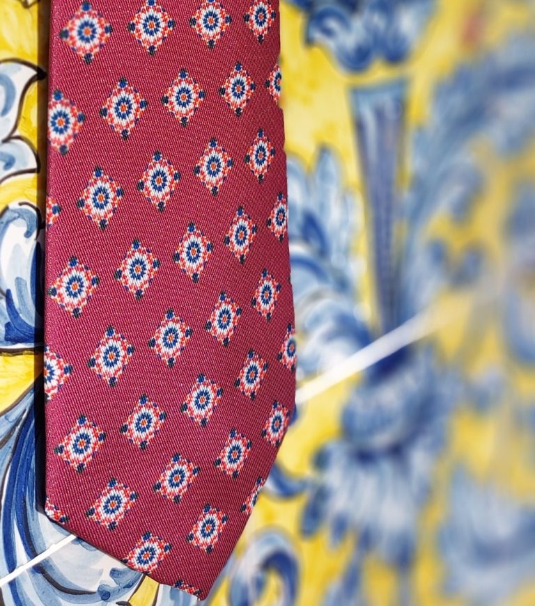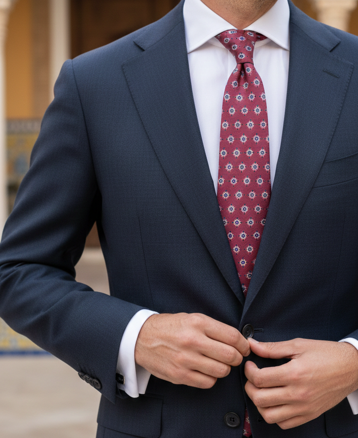 Confeccionada con tejidos de alta calidad y presentada en edición limitada, Borgoña de Palacio forma parte de la colección Símbolos de Andalucía, una serie de corbatas que elevan los símbolos históricos del sur a un lenguaje de elegancia actual.