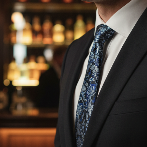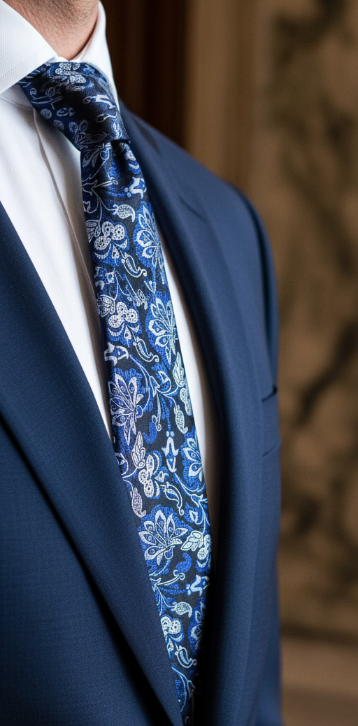 Esta corbata reinterpreta el clavel andaluz desde la sobriedad y la elegancia. Con un fondo azul marino profundo y detalles florales, ofrece un equilibrio perfecto entre lo festivo y lo clásico. Un modelo versátil, con alma flamenca y porte distinguido.