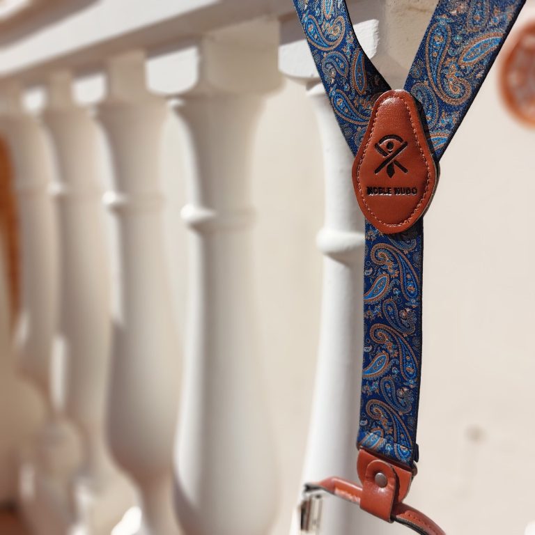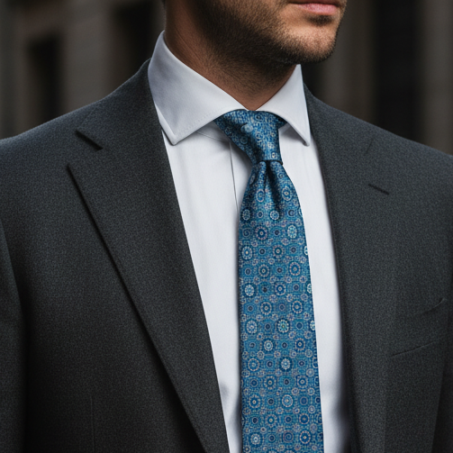 Con un azul profundo y un diseño simétrico de inspiración clásica, esta corbata transmite elegancia con carácter. Su tono cobalto recuerda la solemnidad de los mantos procesionales y la riqueza visual de los azulejos palaciegos. Un modelo ideal para quienes buscan presencia sin excesos.