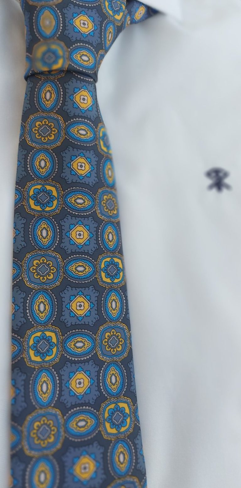 Inspirada en los mosaicos y geometrías clásicas del patrimonio romano andaluz, esta corbata luce un patrón simétrico en azul, mostaza y celeste. Un homenaje refinado a la historia y el arte, ideal para quienes aprecian la elegancia con carácter cultural.
