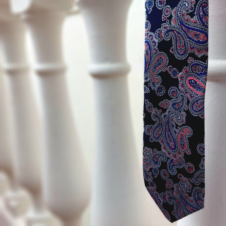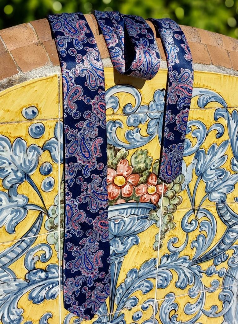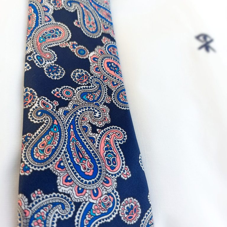 Con un elegante estampado paisley en tonos azul marino, rosa y turquesa, esta corbata evoca la riqueza ornamental de los antiguos tejidos orientales. Su diseño detallado y colores vibrantes la convierten en una opción perfecta para destacar con distinción y estilo.