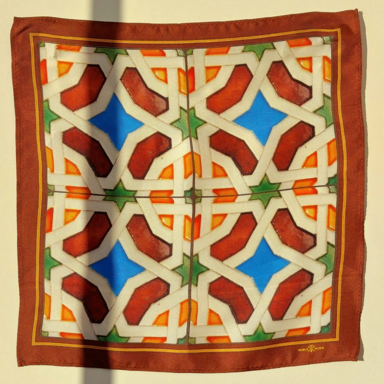 Pañuelo Albero Nazarí: La luz de la tierra andaluza sobre seda natural, aportando calidez y un contraste orgánico.