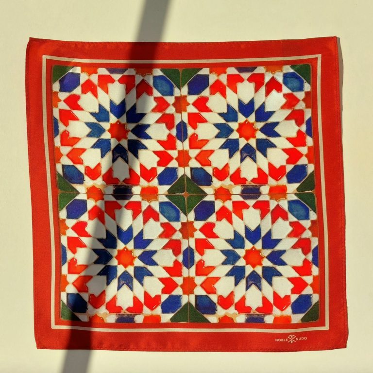 Pañuelo Fuego Andaluz: La calidez de los tonos fuego en seda natural, creando un contraste vibrante y sofisticado.