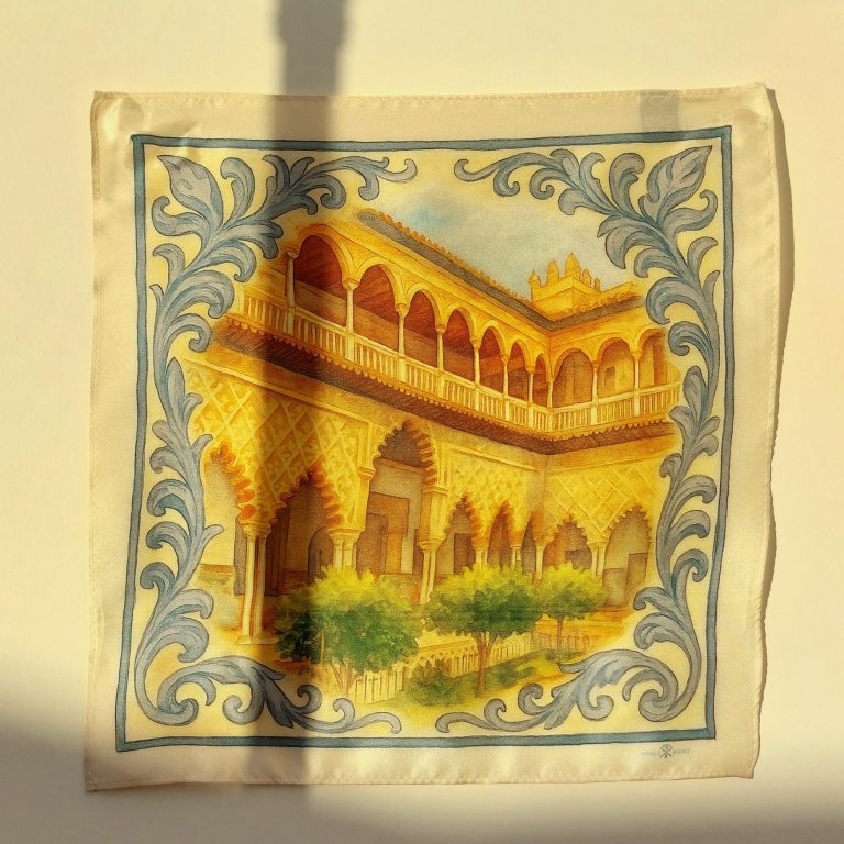 Pañuelo Jardines del Real: Una explosión de color y detalle sobre seda natural. Su diseño artístico aporta el contrapunto de luz necesario para iluminar cualquier traje oscuro.