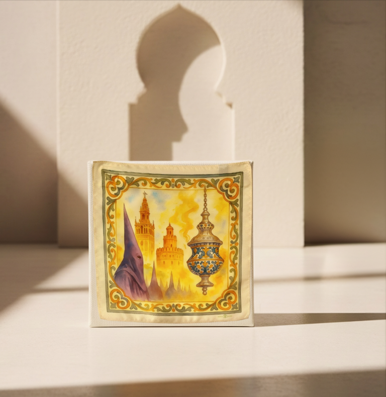 Silencio de Incienso es un pañuelo de bolsillo que captura el recogimiento y la solemnidad de la tradición andaluza. El humo del incienso, la cerámica clásica, la tradición y las siluetas monumentales se unen en una composición artística que transmite calma, respeto y elegancia.
