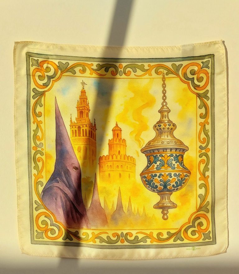 Diseñado en Andalucía y confeccionado en seda natural 100%, este pañuelo pertenece a la colección Esencias de Andalucía, una serie que rinde homenaje a los símbolos, aromas y paisajes emocionales del sur.