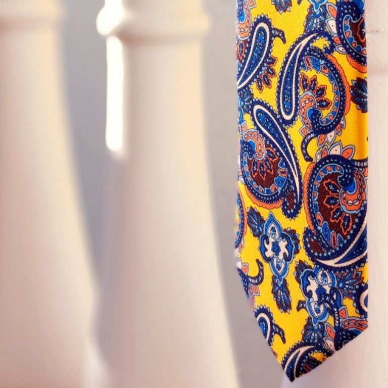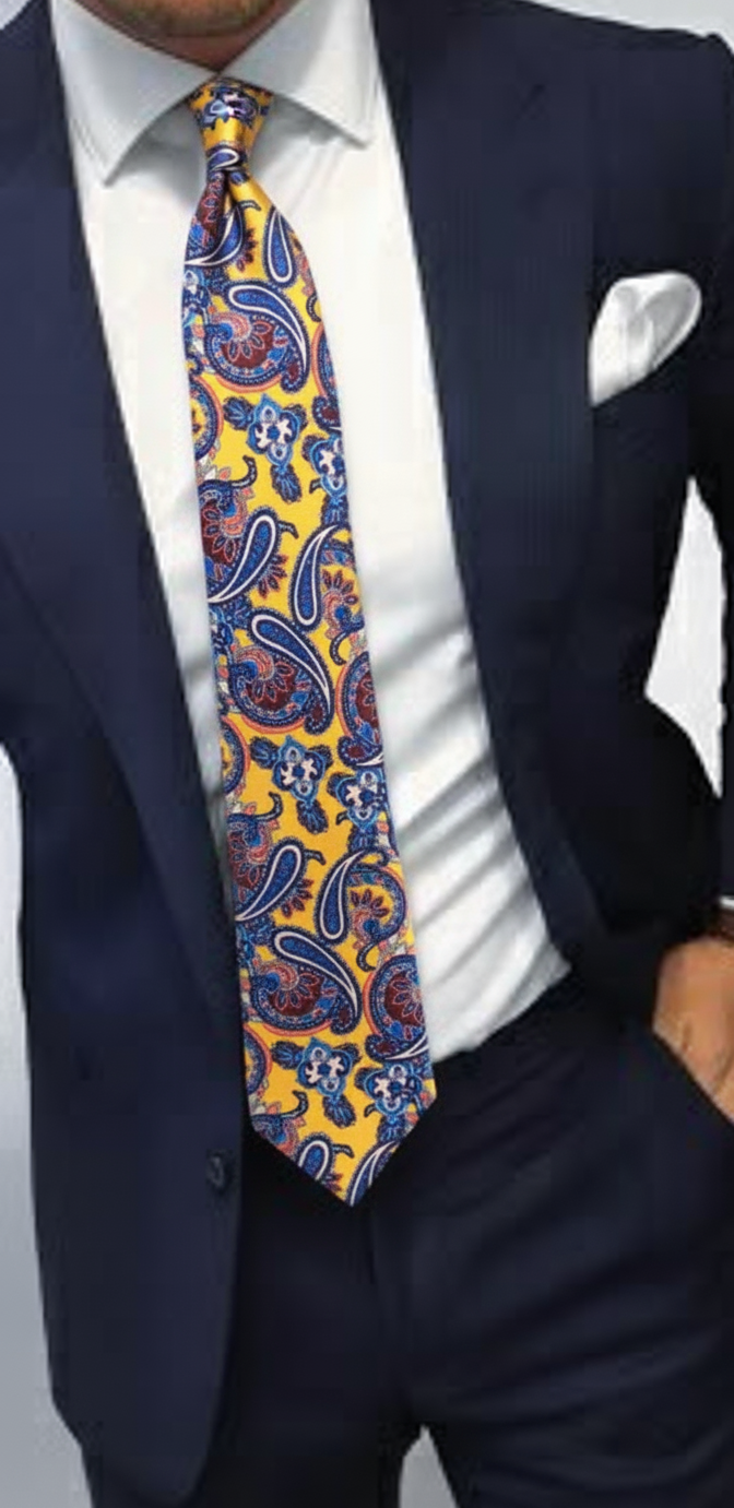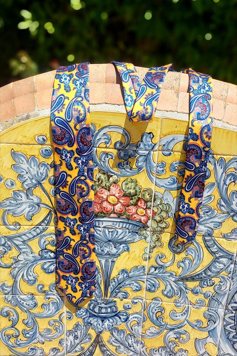 Una corbata de inspiración andalusí, en la que el clásico motivo paisley cobra vida sobre un fondo amarillo vibrante. Su diseño combina tonos azules, rojos y coral que evocan la cerámica tradicional del sur, aportando un equilibrio perfecto entre originalidad y elegancia.