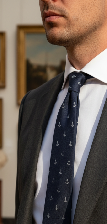 Dos corbatas que unen el alma marinera y popular del barrio trianero con la elegancia del diseño contemporáneo. Su patrón evoca la cerrajería de los balcones que miran al Guadalquivir y el recuerdo de un barrio anclado en su historia. Tradición y carácter en cada nudo.