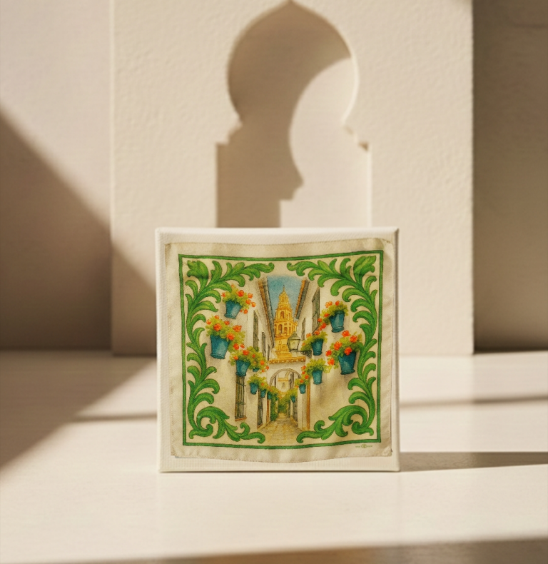 Confeccionado en seda natural 100%, este pañuelo destaca por su suavidad, ligereza y riqueza cromática. Diseñado en Andalucía y producido en edición limitada, Verde Calleja forma parte de la colección Esencias de Andalucía, una celebración visual del patrimonio, los colores y los paisajes que definen el sur.