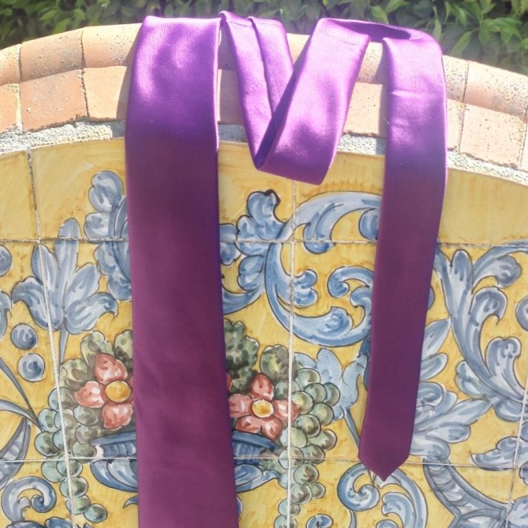 Dos versiones de un mismo homenaje: la calma de los campos sanluqueños y la nobleza del vino. Una corbata en tono morado intenso, sobria y elegante, y otra enriquecida con destellos dorados que aportan distinción y carácter. Inspiradas en la tradición vitivinícola y la espiritualidad serena de Nuestra Señora de la Paz.